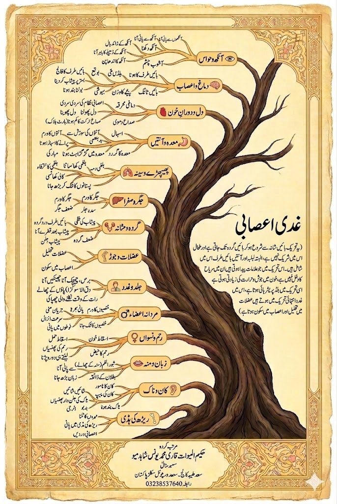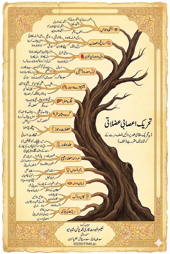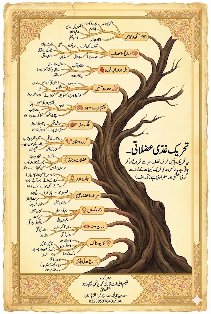 یہ تحریک بائیں طرف نصف سر سے شروع ہوکر شانے تک جاتی ہے۔یہ خالص غدی تحریک کیفیات کے لحاظ سے گرمی خشکی اور صفراوی ہے(آ۔الف)آنکھ کا ناسور۔آنکھ کے پپوٹے کا ورم،آنکھ کی زردی،آنکھوں پر ہلکا ورم ،آوازکا بیٹھنا، آنتوں کی کمزوری، اونچا سننا، اماس، تہوج ،السر معدہ، ایڈز،انتشار کے ساتھ امساک میں کمی،استسقا درد اُل، اٹھرا، الرجی حسا سیت،انگلیاں ٹیڑھی ہونا ، اکڑاؤ تختہ بن جانا،ابکائیاں آنا، اماس، استسقا (ب) بدن کی زردی ،بچہ کی نشوونما رک جانا، بسہری (انگلیوں کی سوزش ) بے چین ھونا یعنی نیند آتی ہے نا سکون ملتا ہے سو جائے تو معمولی ساکھڑاک بیدار کردیتا ہے (پ)پیشاب کی تنگی،پستانوں کا گرم پھوڑا، پستان کا ورم حار،پراسٹیٹ گلیڈ (مثانے کے غدود) کا بڑھ جانا،پیپ تھوکنا،پرانا زخم ،پتہ کے درد سے قے،پتہ کی پتھری، پیشاب میں درد و جلن، پھپھڑوں کی جلن، پھپھڑوں میں پیپ پڑنا، پھپھڑوں میں پانی پڑنا، پیشاب کا زہریلا ہونا، پڑبال ۔ پیشاب کا سیاہ یا سرخ ہونا،پیشاب کے ساتھ خون یا پیپ کا آنا،پیشاب کے قطرے آنا، پیچس(ت)تختہ بن جانا،تشنج مثانہ، تلی کا ورم،ترش ڈکاریںآنا ،تشنج مثانہ (ج)جمرہ (سرخ رنگ کی جلن دار پھنسیاں)جھٹکے سے بے ہوش ہو جانا، جنون دائمی، جبڑے کا کھچاؤ،جسم کا ڈھیلا پن، جسمانی کمزوری،جلد کا پیلا پڑنا، جوڑوں پر آماس، جوڑ و ں کا سوجھ جانا،جی متلانا جلد پر دبانے سے گڑھا پڑنا (چ) چھوٹے جوڑوں کا درد،چہرے پر آماس،چہرے پر خونی ورم (ح)حدبہ مقدم یعنی کمر کے مہروں کا ہلنا،حدبہ موخر کمر کے مہروں کا پچھلی طرف کھچنا (خ)خوف و گھبراہٹ ، خون کے سرخ ذرات کا تباہ ہونا، خصیوں کا ورم،خصیوں میں پانی بھرنا ،خصیوں میں سوجن،خصیوں میںابھار، خفقان قلب ، خروج رحم (د) دورہ پڑنا ، دورہ میں ہاتھ پاوں کا اکڑجانا، دورہ پڑنا اور بولنا بند ہونا،درد ٹانگ، دائیں بازو و ٹانگ کا خود بخود حرکت کر نا، دورے پڑنا ،دل کا سینہ سے باہر نکلتا ہوا محسوس ہونا۔دل کا بھچا ہوا محسوس ہونا،دانتوں کی چمک زائل ہونا(ذ) ذات الجنب،ذائقہ کی تلخی ، ذکاوت حس(ر) ریڑھ ھ کی ہڈی میں پانی پڑنا،رحم میں پانی کی رسولی،رحم کی رسولی اور کثرت حیض،رحم کی جلن،رال بہنا،ریڑھ کی ہڈی میں پانی پڑنا(ز)زرد رنگ کے آبلے، زحیر یعنی پیچس ، زچگی کی دیوانگی،زبان کا کھردرا پن (س) سوزاک، سر چکرانا ،سینہ کی جلن سرسام،سوء القنیہ (خون کا قوام بگڑنا)سن بہری، جسم میں سوئیاں چبھنا،سکتہ ،سوزش جگر،سرعت انزال، سوزش غلاف دل( ش) شقیقہ بائیں طر ف (ع)عصبی کھچاؤ سے درد ٹانگ، عصبی کھچاؤ عسر طمث (غ) غشی (ف) فوطوں میں پانی بھرنا،فتق(آنت اترجانا)( ق ) قطرہ قطرہ پیشاب آنا (ک)کثرت حیض،کم عمری کا نسیان، کانچ نکلنا، کانوں میں شائیں شائیں ہونا، کوا پھو لنا، کتے کاٹے کا جنون کان کا ناسور کان کی پیپ کھانسی سے پیلے رنگ کا مواد نکلنا، کڑوی قے آنا، کانچ نکلنا (گ) گردوں کی نالیوں کا ور م،گلے پڑنا گرمی کے دانے، گردہ کی پتھری ،گردہ کی نالیوں کا ورم، گھبراہٹ (ل)لو لگنا، لبوں پر صفراوی چھالے (م) مہروں کا ٹلنا،منی میں جراثیم نہ ہونا، منی کا پتلا ہونا مثانہ کی جلن۔منہ کی خشکی پیٹ میں مروڑ اٹھنا، میعادی بخار (ٹایئفائڈ ) (ن) ناک کی جلن دار پھنسی،ناک کی الرجی،نتھنوں کی خشکی، ناک بند ہونا، ناروا(جلد پر ابھرنے والی آبلہ نما پھنسی ) ناک کی بدبو ، نرخرے کی سوزش ، نیند کی بے چینی،نیند میں چلنا ،ناسو چشم،ناخن پتلے ہونا (و)ورم غدد وجع المفاصل سوزشی، وزن کا بڑھنا۔ورم خصیۃ الرحم (ھ) ہاتھوں کا جلنا اور درد کرنا،ہاتھ پاؤں کا اکڑ جانا،ہپا ٹائٹس،ہذیان،ہاتھ پاؤں کا سن ہونا اور درد کرنا،ہرے پیلے دست(ی) یرقان کی زردی۔