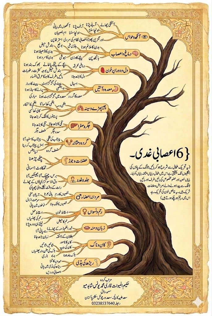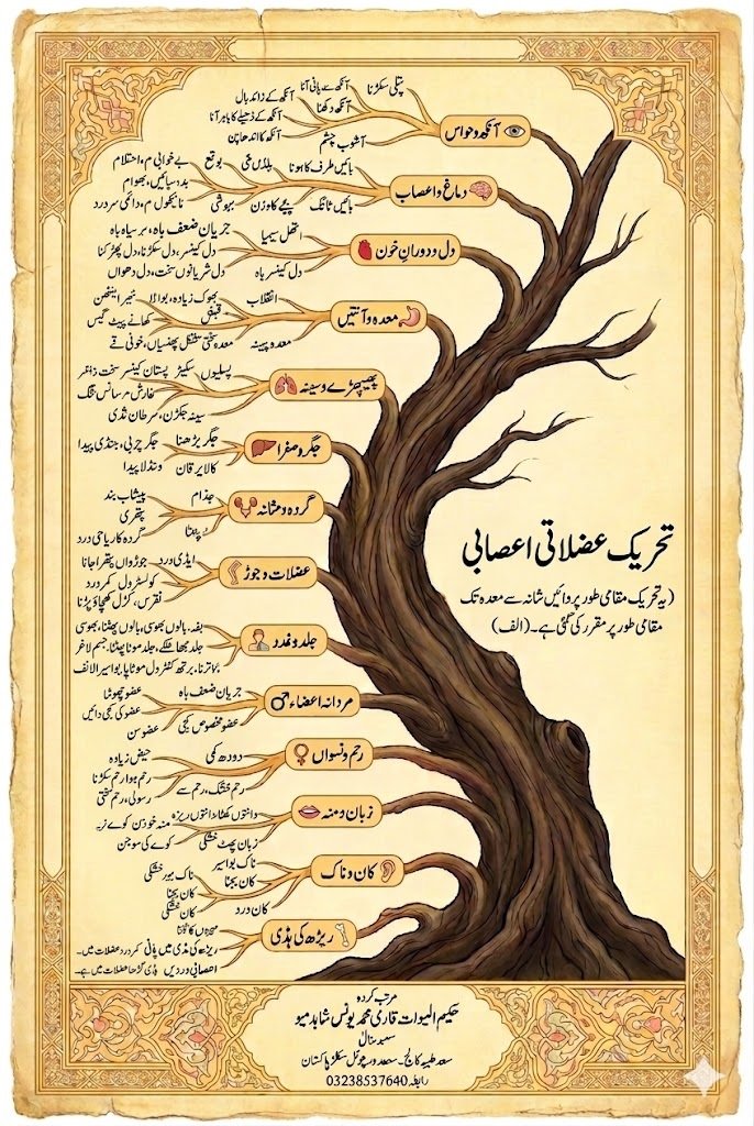 یہ تحریک دائیں طرف جگر سے شروع ہوکر پاؤں کی انگلیوں تک جاتی ہے،اس میں دایاں معدہ، دائیں آنتیں،دایاں گردہ،دایاں خصیہ سرین اور دائیں ٹانگ پاؤں تک شامل ہے سودای تحریک ہے جس میں حرارت کم اور ریاح زیادہ ہوتی ہے (الف) آنکھوں کا اندر دھنس جانا، آنکھوں کی خارش ،آنکھوں گرد سیاہ حلقے،آنکھ کا خونی حلقہ، آنکھ سے جریان خون آوز کا بیٹھ جانا، اختلاج قلب، استسقائے طبلی، اپنڈے سایئٹس، انگڑائی لینا ،اینٹھن،اجابت کا رنگ سیاہ ہونا،اجابت میں خون ہوتو قولون کا زخم ہے (ب)بھوک بند ہونا،بوائی پھٹنا، بے خوابی شدید ،بند نزلہ،بے حس پڑا رہنا(نیند نہ آنا، تھوڑی دیر آتی ہے پھرآنکھ کھل جاتی ہے،بے خوابی(پ)پلکوں کی جوئیں، پلکوں کی خارش، پتے کی پتھری پتہ کا درد۔پھپھڑوں سے خون آنا، پستانوں سے خون آنا،پیشاب کم آنا، پلکوں کے بالوں کااڑنا(ت)تلوں کی کثرت (جسم پر بہت زیادہ تل نکل آتے ہیں ) تپ دق، سل، تھوک میں خون آنا،تلی کا ورم (ٹ)ٹی بی،ٹخنے کا درد و ورم (ج) جوڑوں سے کڑ کڑ کی آوازیں آنا ، جوڑوں کا درد، جسمانی کمزوری،جگر کا کینسر ،جگر کا پتھراجانا،جگر کا سکڑنا،جوڑوں پر درد کے ساتھ سوج آنا، جسم کے کسی حصے کا سن ہوجانا،جمائی آنا، جلق،جگر گردے ٹھنڈے ہونا،جلد پر سرخ دھبے پڑ نا،جریان الدم تحت السرۃ یعنی ناف کے نیچے کسی بھی حصے سے خون آنا جیسے بواسیر بھگندر وغیرہْ جنسی خواہش کا بڑھ جانا۔خوش فہمی کا شکار رہنا(چ) چہرے کا کھردرا ہونا(خ) خارش خشک ، خناق،خونی قے، خونی پیشاب،خون تھوکنا،خشک دمہ،خصیوں کا سکڑنا،خشک کھانسی،خصیوں میں ہوا بھر نا(د)دل میں سوراخ ہونا،دل کادرد،دم کشی،دائیں طرف کی ٹانگ اور ایڈی کا درد،دور کی نگاہ ہونا، دانت پیسنا، دائیں طرف ایڈی کا درد،دائیں طرف کا عرق النساء،دائیں طرف کا حذر (دائیاں حصہ سن ہونا) (ر)رعشہ۔رحم کا پھٹنا۔رحم کا کینسر (ز)زبان کا سرخ ہونا،زبان کا ورم،زبان کا سکڑنا،زبان کا کینسر (س) سل،سرخی چشم،سینے کی خشکی (ص)صفرا کی کمی (ع) عر ق النساء (لنگڑی کا درد )عضو تناسل کا ٹیڑھا پن (غ) غدد کا بڑھ جانا(ف)فالج اسفل (ک)کان میں شائیں شائیں کی آواز آنا ۔ کھانے کے بعد قے آنا،کان سے خون بہنا ، ککرے،کثرت حیض (روہے) کیرا گرنا،کند ذہنی، کیل مہاسے (گ) گلے کی خشکی، گنجا پن،گلٹیاں بننا سارے جسم میں،گلے پڑنا، گردوں کا سکیڑ، گھٹنے کا درد(ل)لبوں کی خشکی،لبوں کا پھٹنا، لاکڑا کاکڑا سے چہرے پر نشان، لیکوریا سے چہرے پر بال،لبوں پر صفراوی چھالے (م) مالیخولیا مراقی،مسوڑوں کا ورم، معدہ کا سکڑنا،منہ پکنا، معدہ کی جلن ، ماسخورہ،مقعد کا ورم،منی کے ساتھ خون آنا،موہکے (ن) ناسور مقعد،ناف ٹلنا ، ناک میں کھرنڈ جمنا،ناک سے خون کے جمے لوتھڑے نکلنا،نچلے جبڑے کا کینسر۔ نچلے دھڑے کا فالج ،نکسیر پھوٹنا،ناسور مقعد،نیند کی کمی(و) ودی کا آنا، ورم گردہ بوجہ تیزابیت ورم مقعد (ھ)ہاتھ پاؤں کا سن ہونا،کسی چیزکا ہضم نہ ہونا،ہونٹوں کا ورم،ہونٹوں کی خشکی ۔،ہاتھ میں کی جلن ہلکی ہلکی حرارت کا رہنا ۔ودی۔
